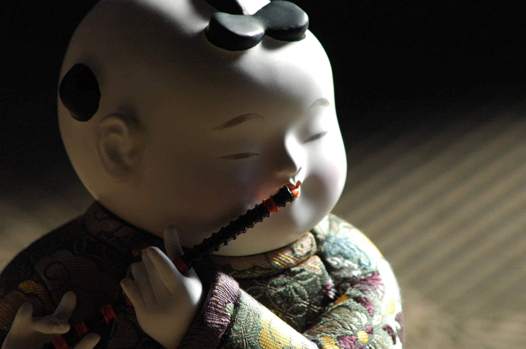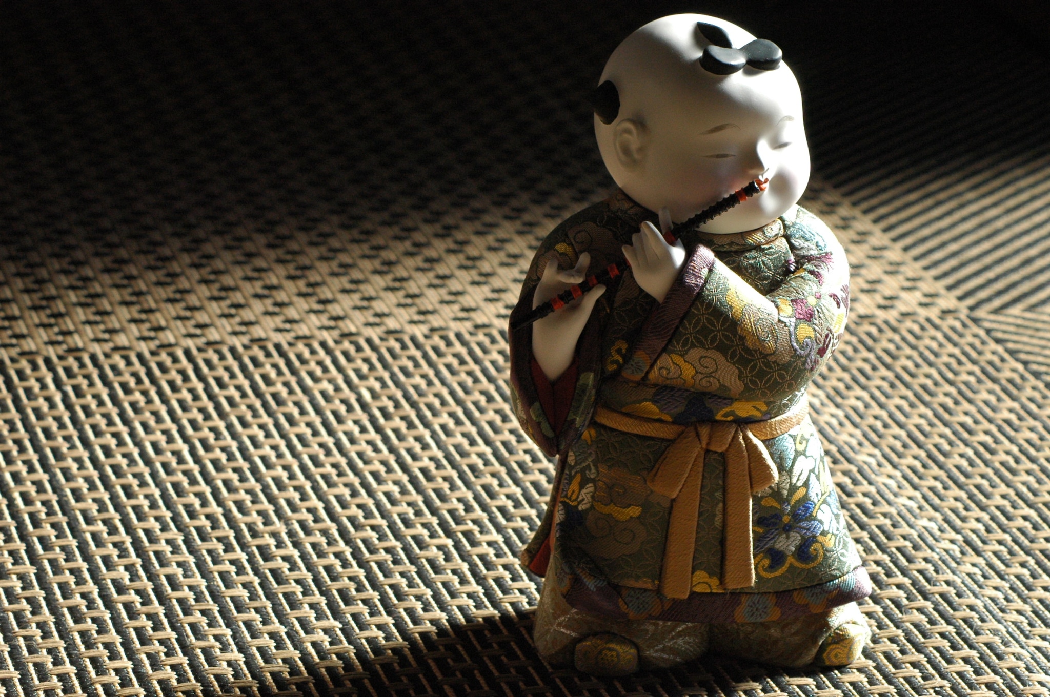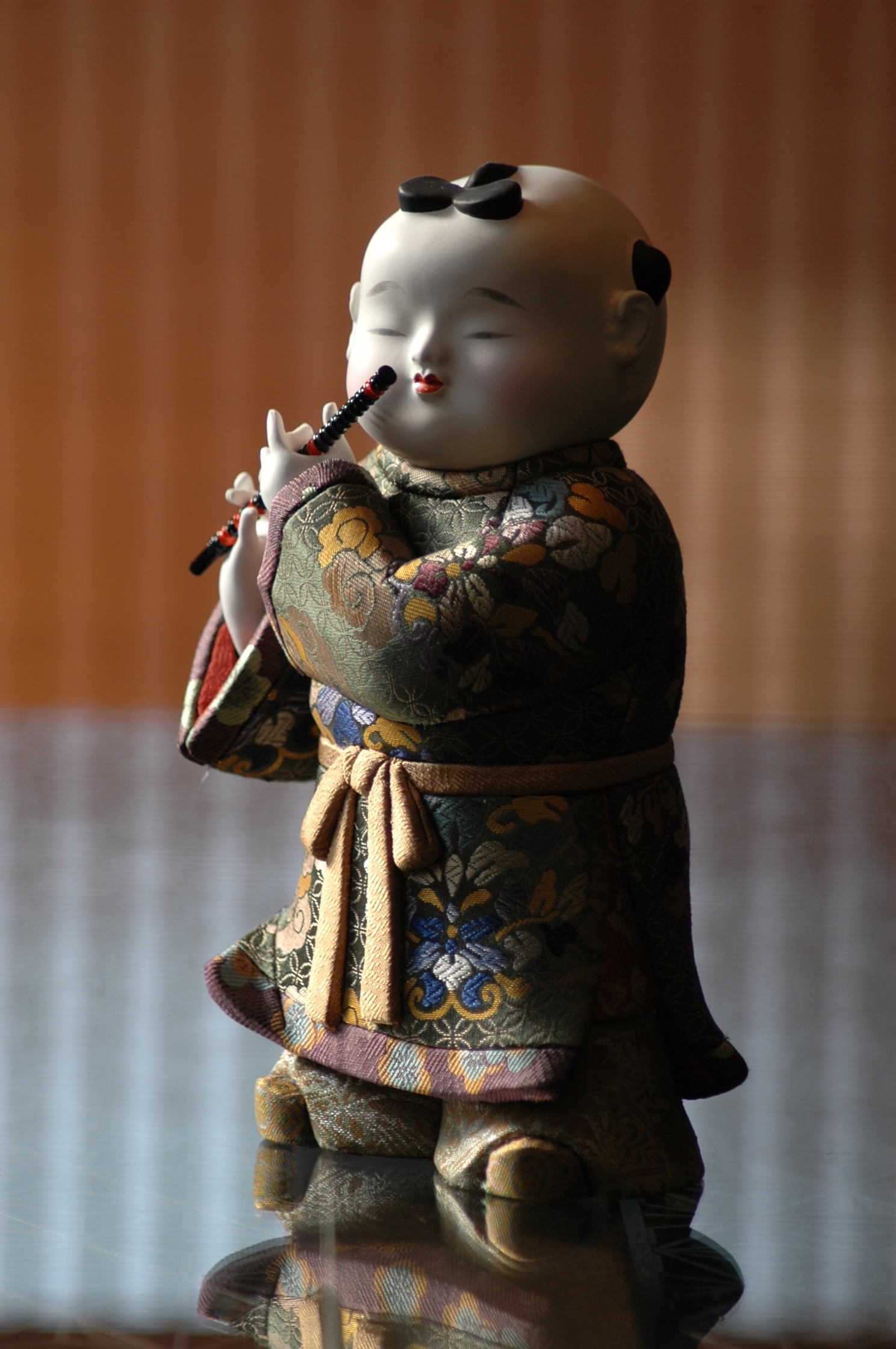 本作は、柔らかな丸顔に穏やかな表情を浮かべ、趣のある佇まいが魅力である。 今にも笛の音が聞こえてくるような躍動感のある人形。