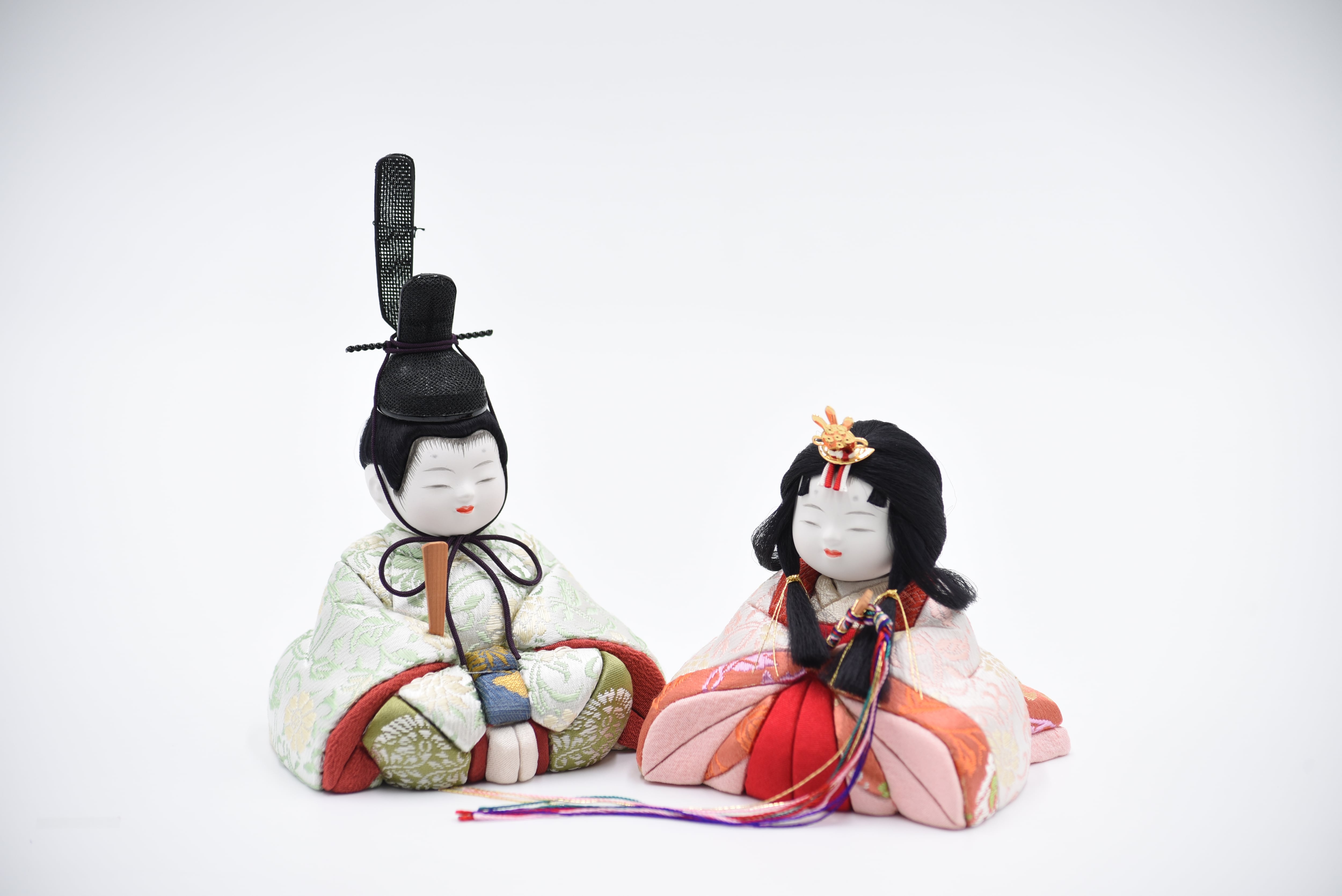 衣裳を着せ付けた衣裳着人形に比べて、衣装(布地)を「木目込む」という技法から着崩れがしにくく、保管しやすいお人形になっております。型崩れの心配がないので、引っ越しなどが多い方でも安心です!
