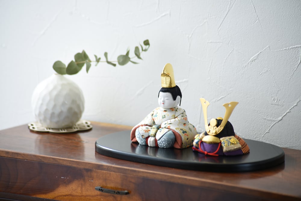 お人形と兜を合わせた、上品でコンパクトな飾りです。